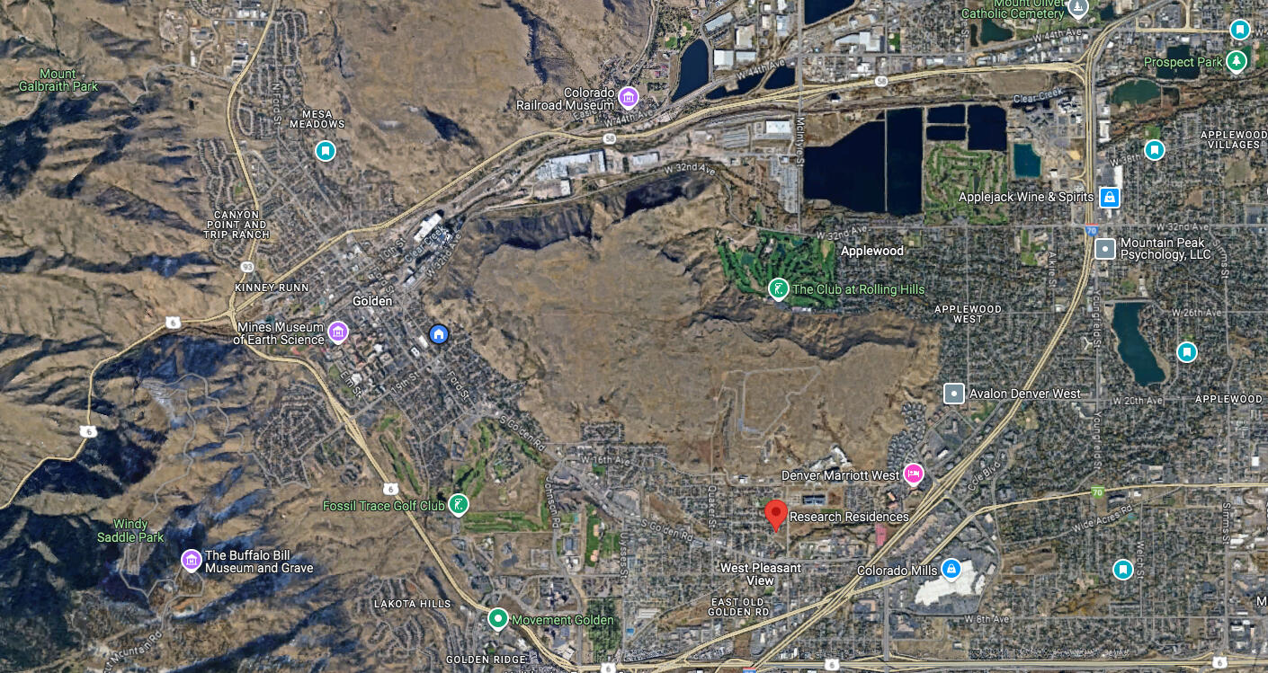 Located on NREL's Research Road! Only a 5 minute walk to the lab's South Entrance Building, one mile to I-70 & 6th avenue, 2 miles to Golden (8 minutes by car, 15 by bus, including the walk to the bus!).